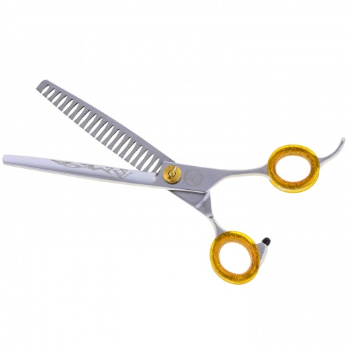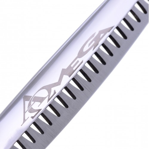 Profesionálne jednostranné riedidlá, nožnice značky P&W Scissors (od Nicka Kontosa), model Alfa Omega. Majú veľmi ostrý okraj a zúbky, ktoré zaisťujú hladké tieňovanie vlasov. Vybavený pohodlnou skrutkou na nastavenie tlaku a gumovými krúžkami. Krátka a ergonomická poloodsadená rukoväť a zabudovaný hák zaručujú vysoký pracovný komfort. Model s reverznou čepeľou pre tzv Európsky štýl, ideálny pre všetky stredné plemená. Vďaka širokým zubom bude rednutie ešte rýchlejšie. Balené v pohodlnom obale s logom výrobcu. POZOR! Všetky produkty P&W Scissors sú dodávané iba v rámci Poľska! Farby prsteňov sa môžu líšiť od vyobrazených na fotografii a posielajú sa náhodne.
