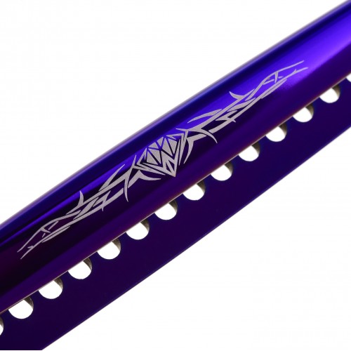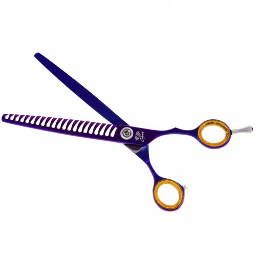 Profesionálne jednostranné riedidlá, chunkery značky P&W Scissors (od Nicka Kontosa), model Carat. Veľmi ostrá rezná hrana zaisťuje hladké tieňovanie vlasov. Precízne mikrobrúsenie na každom zube zabraňuje skĺznutiu vlasov pri strihaní. Vhodné pre mäkké a splývavé kabáty. Vyrobené z vysoko kvalitnej ocele. Nepostrádateľný pri prehliadkach a súťažiach, ako aj v každom profesionálnom salóne. Ergonomická Semi-Offset rukoväť, otočný háčik (zdobený zirkónom) a gumené krúžky zaručujú vysoký komfort práce. Vybavený pohodlnou ozdobnou skrutkou na nastavenie tlaku. Balené v puzdre s logom výrobcu. POZOR! Všetky produkty P&W Scissors sú dodávané iba v rámci Poľska! Farby prsteňov sa môžu líšiť od vyobrazených na fotografii a posielajú sa náhodne.