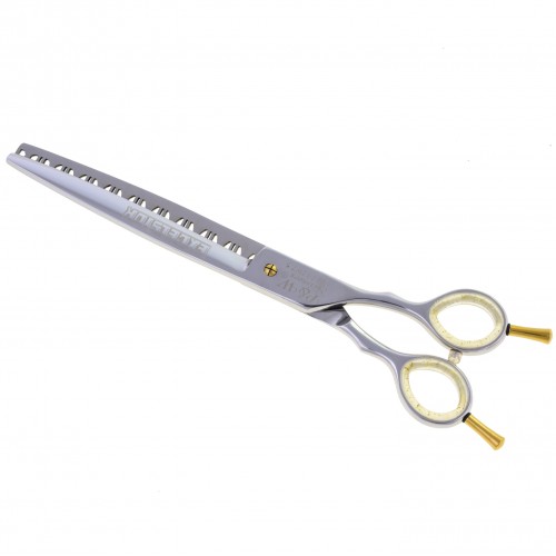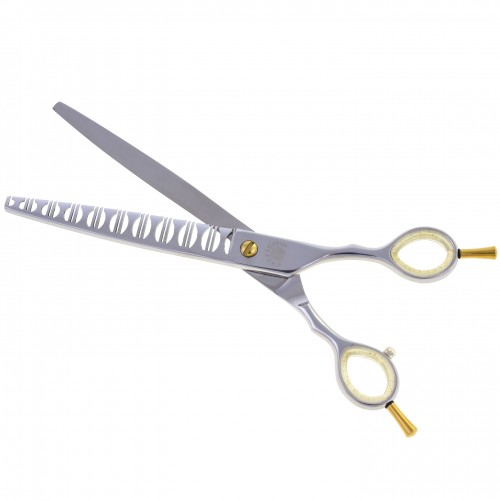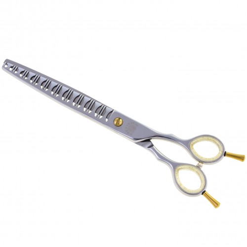 Najkvalitnejšie jednostranné riedidlá Convex značky P&W Scissors (od Nicka Kontosa), model Excelsior s dvoma typmi zubov. Majú veľmi ostrý okraj a vrúbkované zuby, ktoré zabraňujú skĺznutiu vlasov pri strihaní. Zuby riediacich žehličiek sú vyrábané v dvoch rôznych šírkach, čo umožňuje ostrihať veľký objem vlasov a zároveň sa vyhnúť vytvoreniu jasnej línie strihu. Vo vlasoch zostávajúcich po strihaní sa vytvorí dokonalý a prirodzene vyzerajúci prechod. Ušetríte tak čas a zároveň upravíte nerovnomerne odrastené vlasy. Technicky dokonalá kombinácia proporcií a počtu jemných a hrubých zubov umožňuje vykonávať dve úlohy súčasne. Vhodné pre väčšinu plemien, vrátane tvrdých alebo mäkkých. Odporúča sa pre psov týchto typov: čierny ruský teriér, novofundlandský teriér, bouvier, pšeničný teriér. Neodporúčame používať tieto žehličky na kučeravé vlasy. Nepostrádateľný pri prehliadkach a súťažiach, ako aj v každom profesionálnom salóne. Krátka, symetrická rukoväť a obojstranné háky zaručujú vysoký komfort práce. Balené v pohodlnom obale s logom výrobcu. POZOR! Všetky produkty P&W Scissors zasielame iba v rámci Poľska! Farby prsteňov sa môžu líšiť od vyobrazených na fotografii a posielajú sa náhodne.