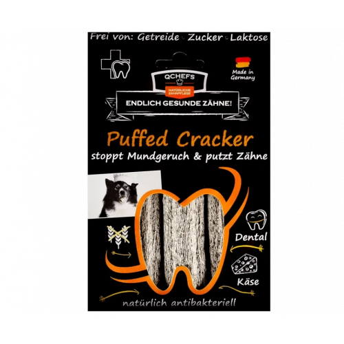 Tyčinky na čistenie zubov pre psov Puffed cracker od QCHEFS je prémiová maškrta nielen pre starostlivosť o zuby vášho psíka. Je vyrobený z tvarohu, pohánky, bioglycerínu a za studena lisovaných olejov z repky a kokosu. Je preto priamo nabitý minerálmi a vitamínmi z vybraných prírodných surovín a hypoalergénnou hodnotnou bielkovinou z tvarohu.