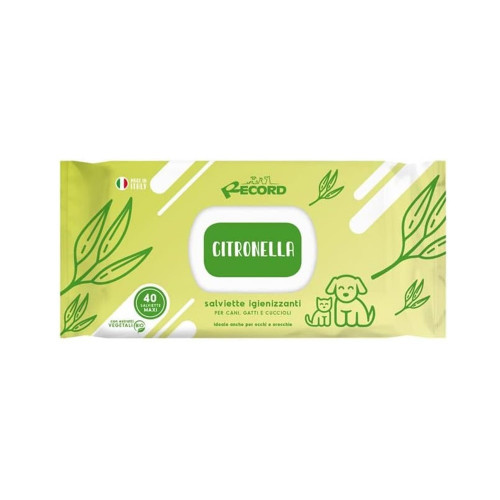 Record Salviette Citronella 40 ks - univerzálne obrúsky na čistenie srsti, očí a uší psov a mačiek, s vôňou citrónovej trávy