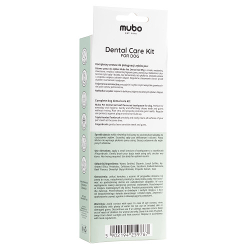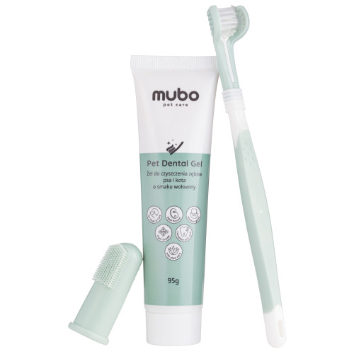 Sada na starostlivosť o zuby Mubo pre psov. Kompletné riešenie pre každodennú ústnu hygienu, ktoré pomáha udržiavať zdravé zuby a svieži dych. Sada obsahuje zubnú pastu, trojstrannú zubnú kefku a prstovú kefku. Pravidelné používanie pomáha znižovať hromadenie zubného povlaku a zubného kameňa, podporuje zdravie ďasien a zlepšuje pohodlie vášho psa. Rôzne spôsoby aplikácie vám umožňujú prispôsobiť si čistiacu rutinu potrebám a temperamentu vášho domáceho maznáčika – od jemnej masáže ďasien až po dôkladné čistenie zubov. Sada na starostlivosť o zuby Mubo pre psov: gélová zubná pasta Mubo Pet Dental Gel 95 g, trojstranná zubná kefka, prstová kefka a čistič zubných kefiek. Gélová zubná pasta Mubo Pet Dental Gel (95 g) pre psov s atraktívnou hovädzou príchuťou je určená pre každodennú ústnu hygienu domácich miláčikov. Aromatické zloženie pomáha odstraňovať povlak a zvyšky jedla z povrchov zubov a podporuje zdravé ďasná. Pridanie aloe a propolisu podporuje zdravie ústnej dutiny a môže pomôcť pri regenerácii podráždených tkanív. Probiotiká pomáhajú udržiavať zdravú mikroflóru v ústnej dutine vášho domáceho maznáčika. Zubná pasta Mubo nevyžaduje oplachovanie, vďaka čomu je čistenie zubov vášho domáceho maznáčika rýchle a jednoduché, čo šetrí čas a námahu. Toto ocenia majitelia psov, ktorí nie sú zvlášť zdatní v ústnej hygiene. Konzistencia pasty navyše umožňuje neuveriteľne jednoduchú aplikáciu. Táto trojstranná zubná kefka pre psov je navrhnutá tak, aby maximalizovala účinnosť čistenia s minimálnym úsilím. Trojitá hlavica pokrýva zub súčasne z troch strán, čo umožňuje dôkladné odstránenie zubného povlaku a zvyškov jedla, a to aj na ťažko dostupných miestach. Jednotlivé povrchy hlavice sú flexibilné, čo umožňuje kefke lepšie sa prispôsobiť tvaru zuba a zabezpečiť presnejšie čistenie. Mäkké štetiny sú šetrné k ďasnám, no zároveň účinné pri každodennej hygiene. Ergonomická rukoväť s protišmykovým reliéfom zaisťuje bezpečné uchopenie a kontrolu počas čistenia zubov. Táto prstová kefka na čistenie zubov psov je jednoduchým a pohodlným riešením pre každodennú ústnu hygienu, obzvlášť odporúčaná, keď si váš maznáčik zvyká na starostlivosť o srsť. Je vyrobená z mäkkého a pružného materiálu a na jednej strane má veľmi mäkké, husté štetiny, ktoré odstraňujú zubný povlak a zvyšky jedla a zároveň sú šetrné k ďasnám. Druhá strana má reliéf (ryhy), ktoré počas čistenia jemne masírujú vnútro ústnej dutiny. Nadstavec umožňuje presné čistenie zubov, najmä v ťažko dostupných miestach, zatiaľ čo priamy kontakt medzi prstom a zubami psa zvyšuje kontrolu tlaku a pohodlie. Výhody súpravy Mubo Dental Care Kit: Komplexná ústna hygiena pre psov. Jemné čistenie zubov a ďasien. Pomáha odstraňovať zubný povlak a zvyšky jedla. Podporuje ochranu pred zubným povlakom a zubným kameňom. Rýchle a dôkladné čistenie zubov zo všetkých strán vďaka trojstrannej kefke. Jemné čistenie a masáž ďasien vďaka nadstavcu na prst. Vhodná na každodenné použitie u psov všetkých vekových kategórií. Pomáha vytvoriť si pravidelnú rutinu ústnej hygieny. Návod na použitie: Naneste malé množstvo gélovej zubnej pasty na zubnú kefku alebo nadstavec na prst. Čistite zuby psa jemnými ťahmi. Zubná pasta nevyžaduje oplachovanie. Pre dosiahnutie najlepších výsledkov používajte denne. Zloženie gélovej zubnej pasty: Voda, sorbitol, glycerín, laurylsulfát, hydratovaný oxid kremičitý, probiotiká, celulózová guma, sacharín, benzoan sodný, hovädzia aróma, dimetylglycyrhizinát, propolis, aloe. Bezpečnostné opatrenia: Zabráňte kontaktu s očami. Ak sa zubná pasta dostane do očí, ihneď ich vypláchnite veľkým množstvom vody. Nepoužívajte na podráždenú pokožku alebo poškodené ďasná. Prestaňte používať, ak sa objaví alergická reakcia. Uchovávajte mimo dosahu detí. Tento výrobok je určený len pre zvieratá. Skladujte na chladnom a suchom mieste, mimo dosahu priameho slnečného žiarenia a zdrojov tepla. Obsah/obal zlikvidujte v súlade s platnými predpismi.