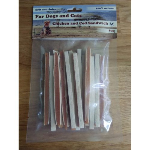 Zloženie: kuracie mäso 72,3%, treska 11,5 %, škrob 2%, 2,2% sorbit, 10,5% glycerín, 0,2% soľ, 3,5% rast.proteín