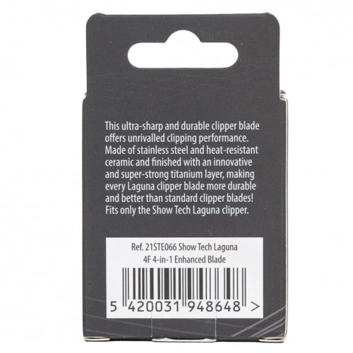 Náhradná čepeľ pre holiaci strojček Show Tech Laguna: Laguna 4v1 Enhanced Blade č. 4F. Vrchná časť čepele je vyrobená z kvalitnej nehrdzavejúcej ocele, vrchná keramická čepeľ je pokrytá titánovým povlakom. Tento dizajn v porovnaní so štandardnou oceľovou čepeľou znamená, že sa hlava menej zahrieva a zostáva dlhšie ostrá. Čepeľ je vhodná na strihanie všetkých typov a dĺžok vlasov, čím zaisťuje hladký koniec. Dĺžka rezu 9 mm. Čepeľ pre zastrihávač Show Tech Laguna č. 4F: pre zastrihávač Show Tech Laguna, spodná čepeľ vyrobená z nehrdzavejúcej ocele, ultratenká horná čepeľ, keramická čepeľ s titánovým povrchom, zaisťuje hladký rez, odporúčaná pre dokončovacie práce, zostane dlhšie ostrá. , menej sa zahrieva, dĺžka rezu: 9 mm (pre najvyššie nastavenie čepele) Poznámka! Čepeľ nie je možné prebrúsiť. Akonáhle sa stane nudným, musíte si kúpiť nové. Nezabudnite čepeľ pravidelne čistiť a olejovať, aby ste predĺžili jej životnosť.