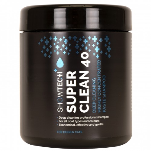 Vysoko koncentrovaný čistiaci šampón vo forme pasty. Vhodné pre psov a mačky s akýmkoľvek typom srsti. Vhodný na predpieranie a ako hlavný šampón. Prípravok zanecháva vlasy svieže a bezchybne čisté, výnimočne lesklé, bez zmeny ich štruktúry. Udržuje vlasy pevné a zdravé a odstraňuje všetky nečistoty, mastnotu a nánosy stylingových produktov. Poradí si aj s tými najsilnejšími, mastnými nečistotami. Super Clean 40 ľahko vyčistí hustú, kučeravú srsť. Okrem toho kozmetika odstraňuje nepríjemné pachy a zanecháva srsť čistú s príjemnou sviežou vôňou. Vďaka svojej vysoko koncentrovanej receptúre je ekonomický a ideálny pre časté profesionálne použitie. Skutočná nevyhnutnosť pre strihačov a chovateľov Ako používať Show Tech Super Clean 40: Zmiešajte 2 polievkové lyžice šampónu s 1 litrom teplej vody. Zriedený šampón naneste špongiou a dobre vmasírujte do srsti, kým nezískate bohatú penu. Nechajte pôsobiť 5 minút a potom dobre opláchnite vodou Vlastnosti šampónu: vysoko koncentrovaný čistiaci, účinný, vo forme pasty pre psov a mačky, pre všetky typy srsti, odstraňuje nepríjemné pachy, ekonomický, vhodný na časté používanie.