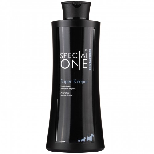 Special One Super Keeper je profesionálny a jedinečný kozmetický prípravok kombinujúci oleje, polysacharidy a ďalšie cenné látky, vybraný tak, aby udržal srsť psa v najlepšej kondícii. Je určený pre všetky druhy srsti. Jeho jedinečná štruktúra obaľuje vlasy, jemne ich hydratuje a chráni pred poveternostnými vplyvmi a vysušovaním. Prípravok tiež uľahčuje rozčesávanie a zabraňuje zamotávaniu. Olejové zloženie prípravku regeneruje vyčerpané vlasy, hydratuje a chráni ich, dodáva im lesk a pružnosť už od prvého použitia. Aktívne zložky obsiahnuté v Super Keeper okrem hĺbkovej hydratácie stimulujú vlasové folikuly, čo podporuje rast vlasov a znižuje ich vypadávanie. Ide o profesionálnu kozmetiku odporúčanú na použitie v salónoch pre starostlivosť o vlasy Aktívne zložky: glycerín: regeneruje poškodené, tenké, lámavé a suché vlasy. chráni vlasy pred škodlivými účinkami vonkajších faktorov; vďaka jeho pôsobeniu živiny prenikajú do vlasov fruktóza: dodáva vlasom ľahkosť a lesk, dokonale hydratuje vlasy a zabraňuje štiepeniu končekov hydrolyzovaný kolagén: posilňuje vlasy, zlepšuje elasticitu pokožky, jeho primeraná hladina eliminuje vypadávanie vlasov, zabraňuje dehydratácii vlasov, redukuje vlasy lámavosť med: vyživuje a obnovuje vlasy, dodáva lesk, hebkosť, hydratuje, urýchľuje rast vlasov kyselina hyalurónová: obnovuje poškodené vlasové štruktúry, vypĺňa medzery vo vlasovom korienku, regeneruje, posilňuje, zvlhčuje a urýchľuje rast vlasov Dva spôsoby použitia: Zriediť 15 ml Super Keeper s 1 l teplej vody. Zmiešajte a pomocou sprejovej fľaše nastriekajte celý povrch srsti vášho psa a dôkladne vmasírujte. Nechajte pôsobiť 10-15 minút a potom aplikujte masku Special One Bio Energy Plus Produkt môžete tiež ihneď zmiešať s maskou Bio Energy Plus (15 ml Super Keeper + 100 ml Bio Energy Plus + 900 ml vody) a naniesť. suchého, špinavého psa pomocou špongie a nechajte asi 15 minút pôsobiť, bez oplachovania pokračujte v kúpaní