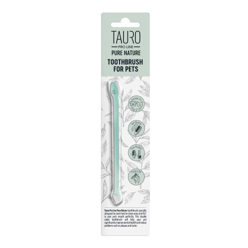 Obojstranná zubná kefka Tauro Pro Line Pure Nature je špeciálne navrhnutý nástroj pre domácich miláčikov, ktorý účinne zaisťuje zdravie ústnej dutiny a zubov. Mäkké štetiny robia proces čistenia zubov pre vášho maznáčika oveľa príjemnejším. Vďaka nim je povlak nahromadený medzi zubami efektívne a bezbolestne odstránený. Pravidelná a správna starostlivosť o zuby a jazyk vášho maznáčika znižuje riziko hromadenia plaku a zubného kameňa a zároveň neutralizuje zápach z úst.