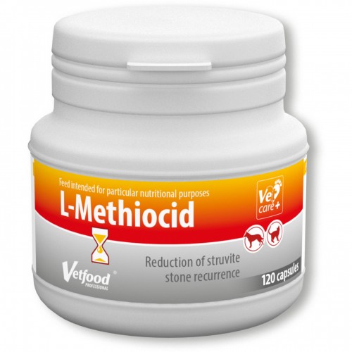 L-Methiocid je prípravok, ktorý podporuje činnosť močového systému a znižuje riziko struvitovej urolitiázy u psov a mačiek. Odporúča sa najmä pre domáce zvieratá so struvitovými kameňmi a bakteriálnymi infekciami dolných močových ciest. Preventívne ho možno užívať pri riziku infekcie močových ciest. Jeho hlavnou zložkou je L-metionín, ktorý okysľuje moč a žlč, vďaka čomu priaznivo pôsobí pri prevencii tvorby usadenín v močových a žlčových cestách, čím predchádza ich infekcii. Všetky suroviny obsiahnuté v prípravku sú Human Grade, čo znamená ich vysokú kvalitu a sú konzumovateľné aj pre ľudí Použitie: Odporúča sa podávať nasledujúce množstvá prípravku počas jedla v závislosti od telesnej hmotnosti zvieraťa: zvieratá < 10 kg. - 1 kapsula každých 12 hodín zvieratá 10-25 kg - 2 kapsuly každých 12 hodín zvieratá > 25 kg - 3 kapsuly každých 12 hodín Odporúčaná dĺžka užívania je 6 mesiacov. V prípade potreby môžete kapsulu otvoriť a zmiešať jej obsah s vašou obľúbenou pochúťkou. Ak je spôsob kŕmenia založený len na suchom krmive, treba ho mierne navlhčiť, aby sa obsah kapsuly prilepil na krmivo a zviera ho skonzumovalo. Zloženie: hydrolyzát hydinového proteínu, želatína (poťah), zemiakový škrob, stearan horečnatý Senzorické prísady: L-metionín (500 mg/2 kapsuly), oxid titaničitý (škrupina) Analytické zložky: hrubý proteín 61,2 %, hrubá vláknina 1,4 %, hrubý tuk 3,8 %, popol 2,6 %, vápnik 0,0 %, fosfor 0,1 %, sodík 0,0 %, horčík 0,2 %, draslík 0,0 %, chlorid 0,0 %, síra 7,6 %, škrob 14,1 %
