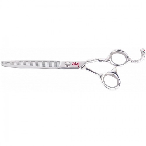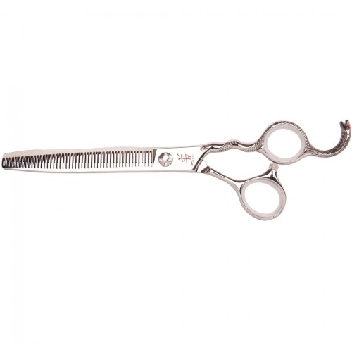 Model Cobra je ručne kovaná riediaca žehlička vyrobená z najkvalitnejšej japonskej nerezovej ocele 440C s prídavkom kobaltu s tvrdosťou Rockwella 61. Odporúčaná na konečnú úpravu účesu väčšiny plemien. Čepeľ ostrá ako žiletka a zuby s mikrozárezmi ľahko prerežú akýkoľvek typ odevu. Určené pre profesionálov, ktorí očakávajú špičkové vybavenie. Prerieďovacie nástroje majú mimoriadne zaujímavý dizajn, aerodynamický tvar spodnej čepele a bohato zdobená rukoväť s opierkou prstov v tvare hada určite osloví každého. Dlhá a úzka čepeľ zaisťuje bezpečné a presné rezanie. Upravené vo vysokom lesku pôsobia veľmi elegantne. Balené v praktickom kufríku pre bezpečné skladovanie a prepravu. celková dĺžka: 18 cm dĺžka čepele: 9 cm hmotnosť: 78 g